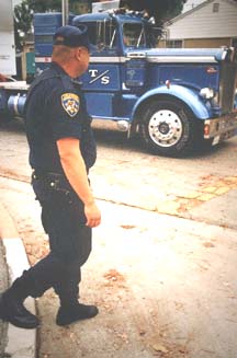 Let's take a look. I have just passed Officer Brown who is sitting on his bicycle by the curb and talking to a friend. On my right side, or passenger side, Officer Blue is about to cross the street.